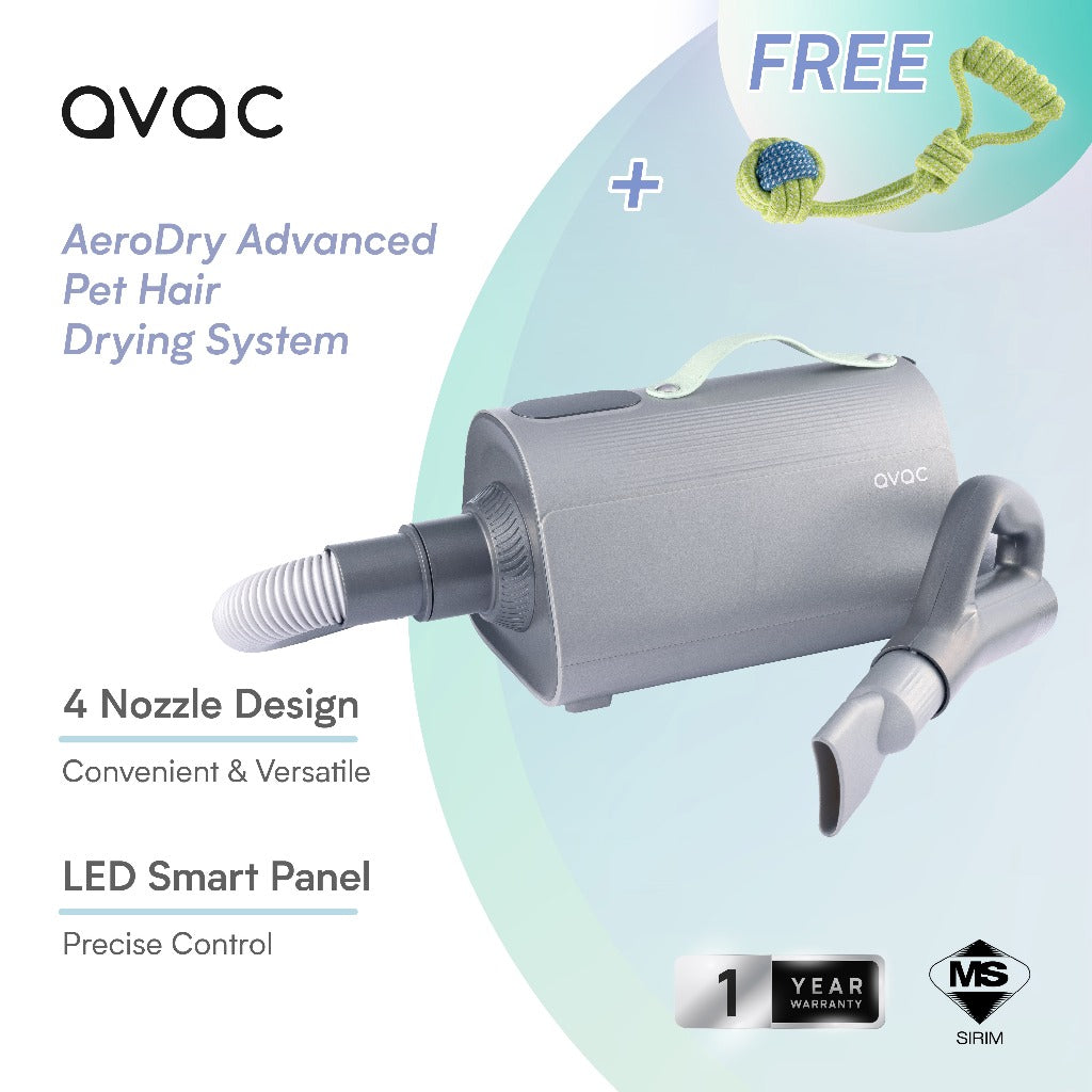 The AeroDry Advanced Pet Hair Force Dryer efficiently dries pet fur after a bath, providing a powerful and versatile solution for quick drying while ensuring pet comfort.